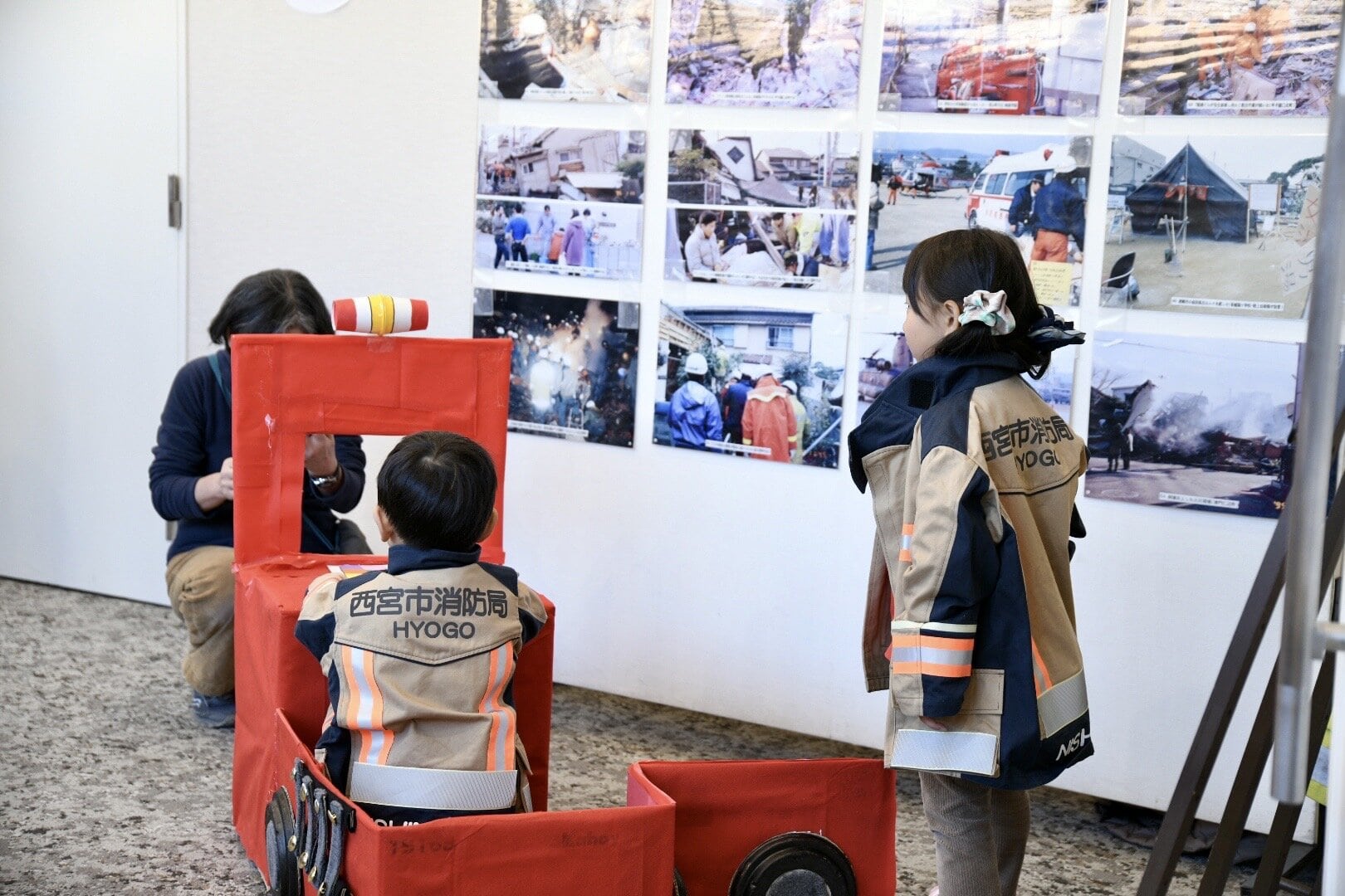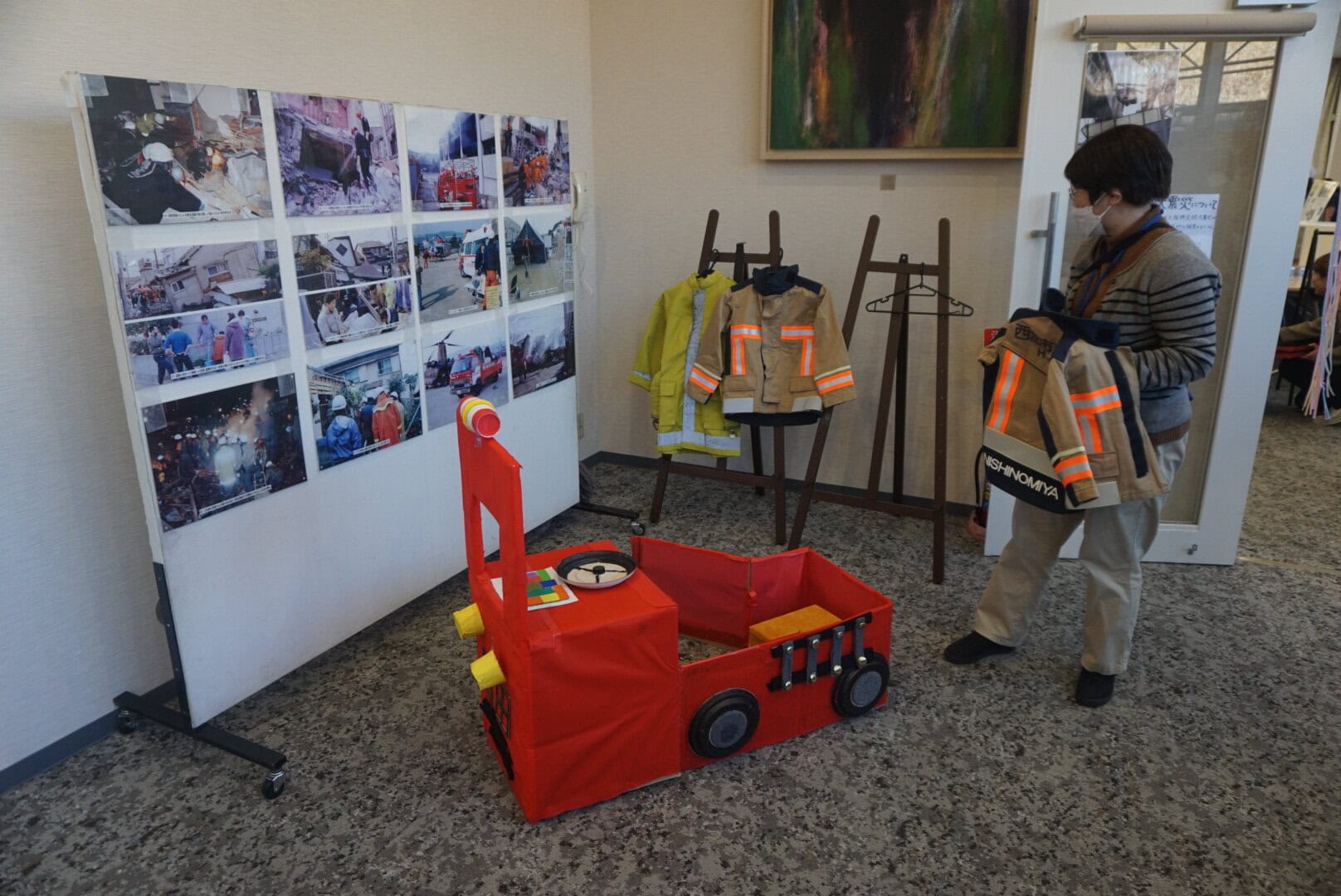 入り口には、お子さんが試着できる防火服🧑‍🚒お手製の消防車の撮影ブースが可愛かった🚒