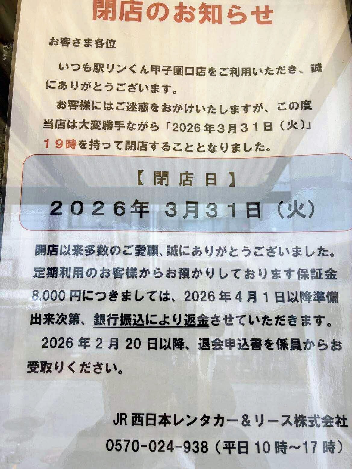 JR甲子園口北改札出てすぐの「レンタサイクル 駅リンくん 甲子園口店」が閉店するようです。