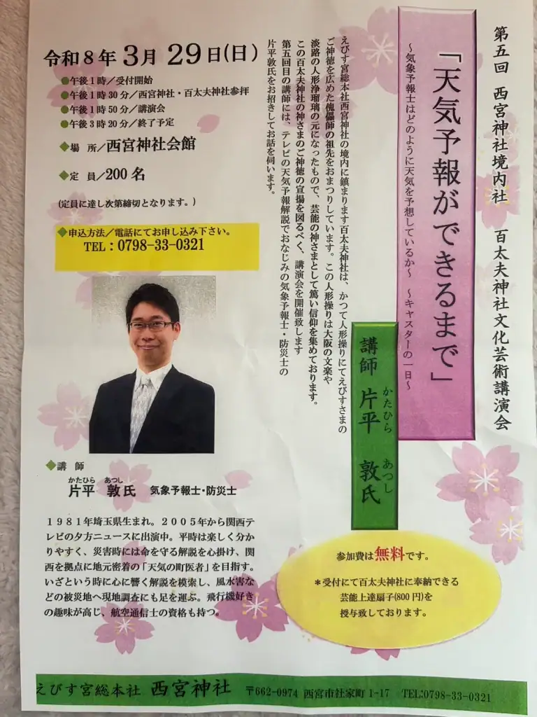 気象予報士の片平敦さんが西宮神社にくるみたい。キャスターの裏話が聞けるかも3/29(日)