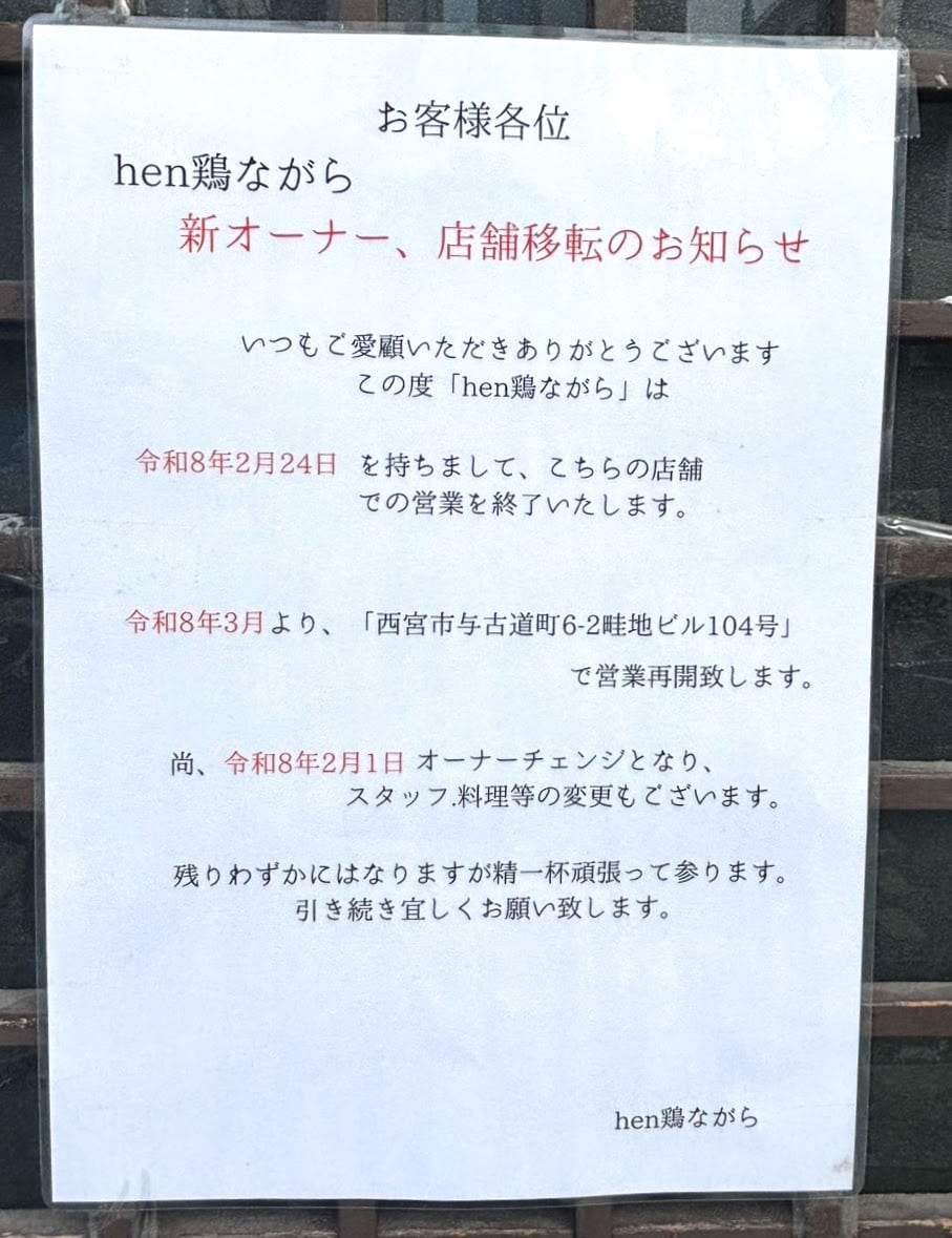 甲子園で親しまれてきた「hen鶏 ながら」ですが、3月からは阪神西宮駅近くへ移転予定とのこと。新たなスタートで、今後どんなお店になっていくのか気になりますね〜😄