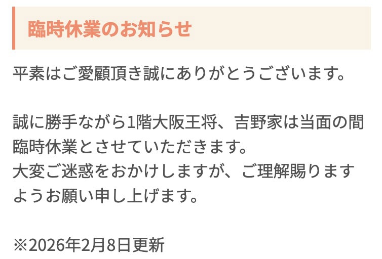 コロワ甲子園1階にある、「大阪王将」と「吉野家」が臨時休業しています。