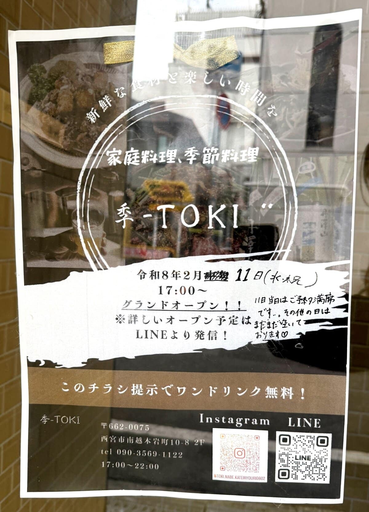 苦楽園口駅ちかくに「季節料理 季-TOKI」ができるみたい。2月11日オープン