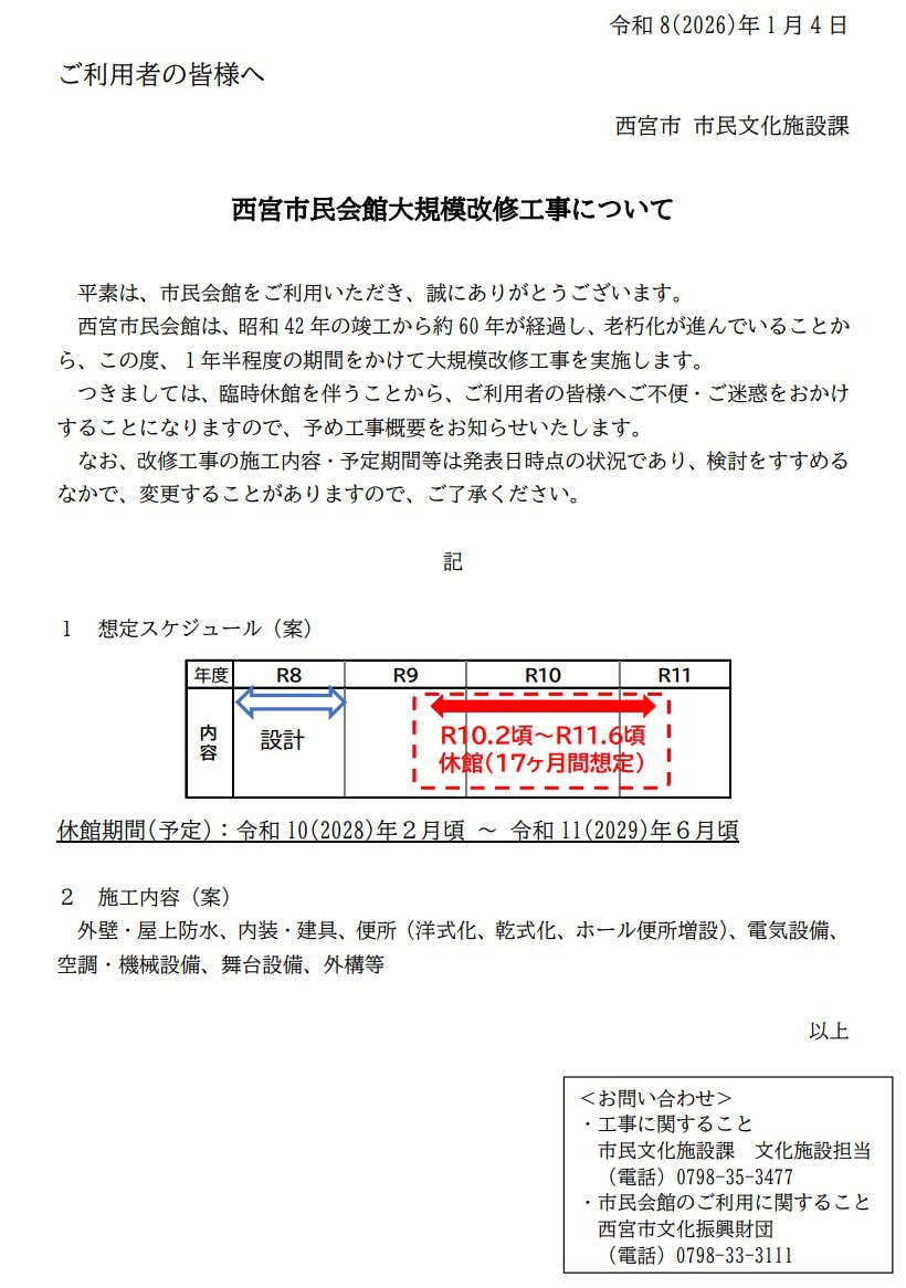 西宮市民会館(アミティ・ベイコムホール)で、大規模改修工事が行われるようです。