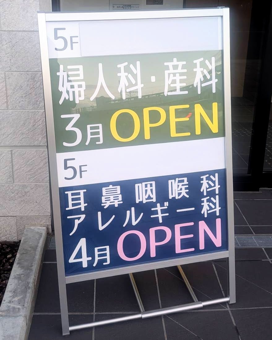 ビルの前にはオープンを知らせる看板も出ていました。婦人科さんの情報も記事にしています〜