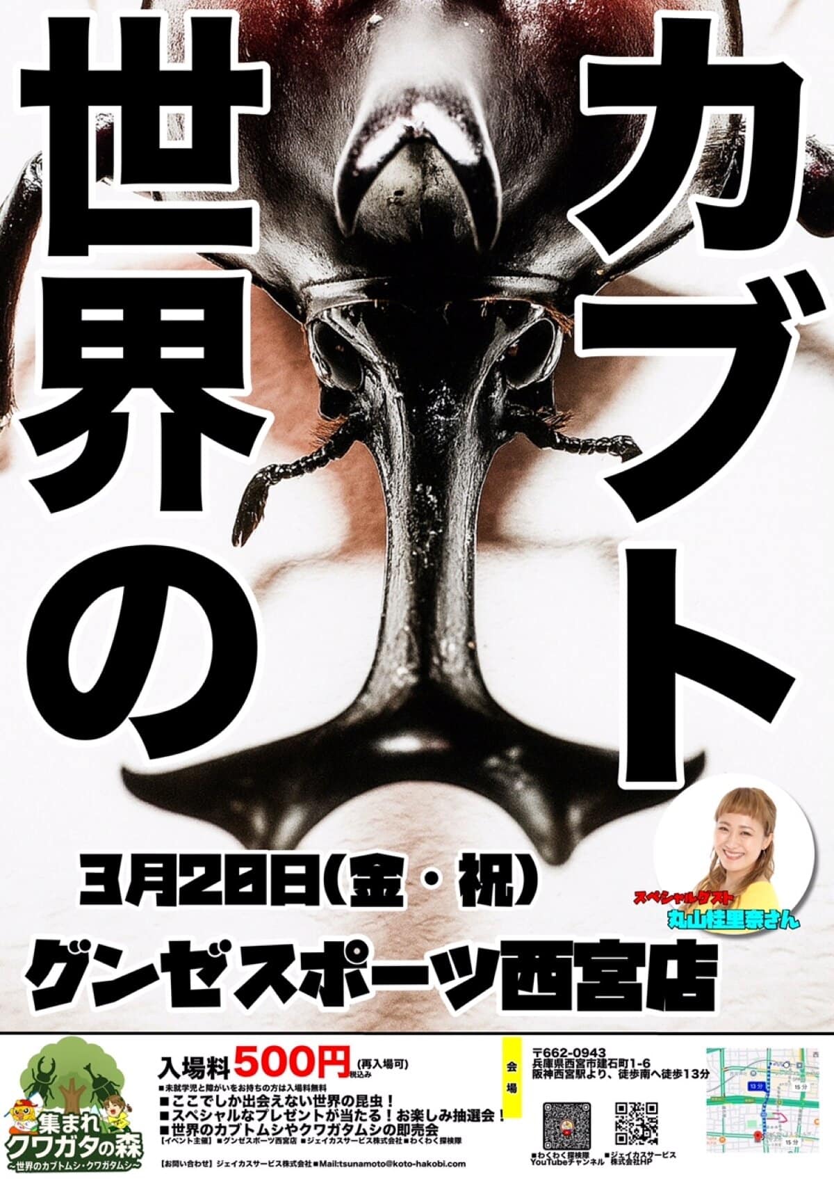 3月20日(金・祝)、グンゼスポーツ西宮店に、世界各国のカブトムシ・クワガタムシが集まるようです。