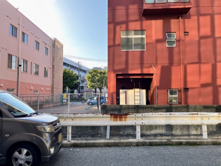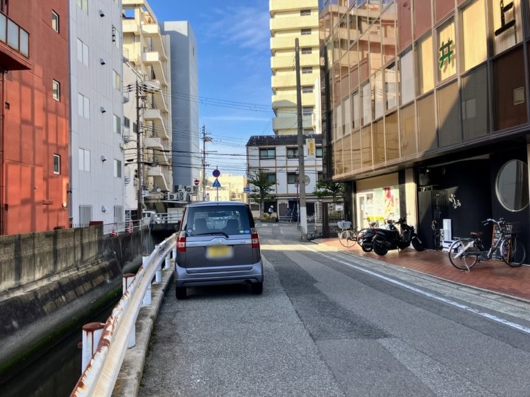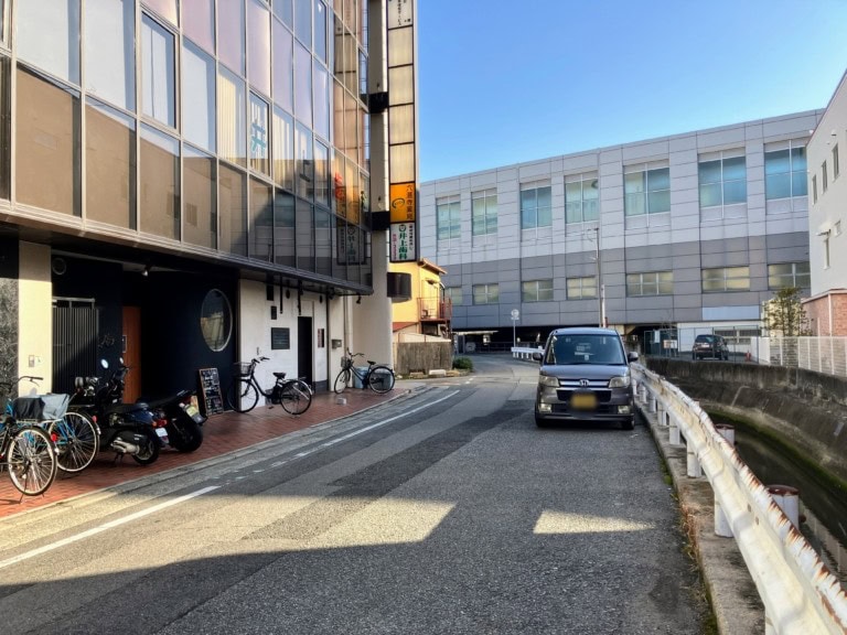 お向かいは六湛寺川で向こうに見えてるのは札場筋線。セブンイレブンがあるところ。