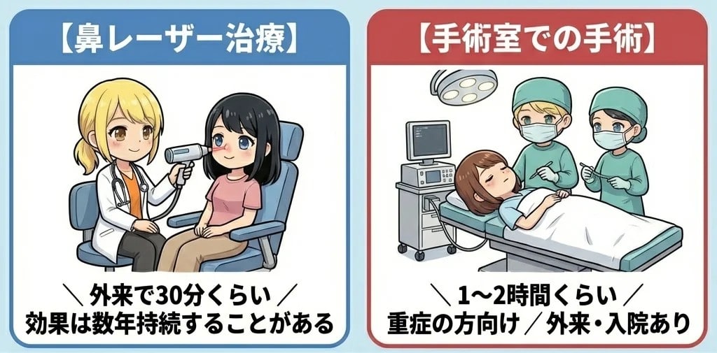 レーザー治療:術後1〜2週間は痛みや出血、一時的な鼻づまりが増えることがあります。効果の持続期間には個人差があり、数年後に再治療が必要となる場合があります。費用は保険適用で両鼻1万円前後(3割負担時。医療機関により異なります)。