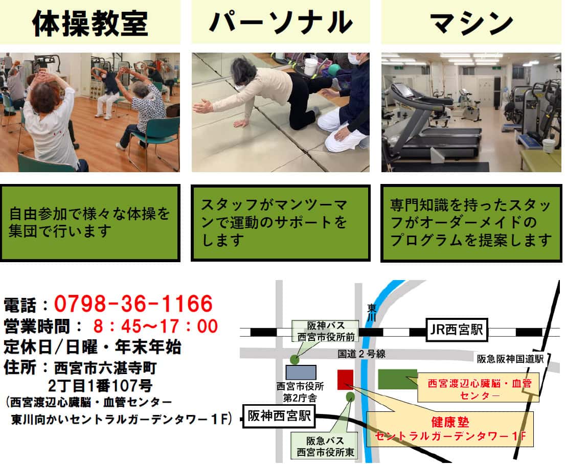 そんな方に知っておいてほしいのが、西宮渡辺心臓脳・血管センターの東川向かい(セントラルガーデンタワー1F)にある健康塾