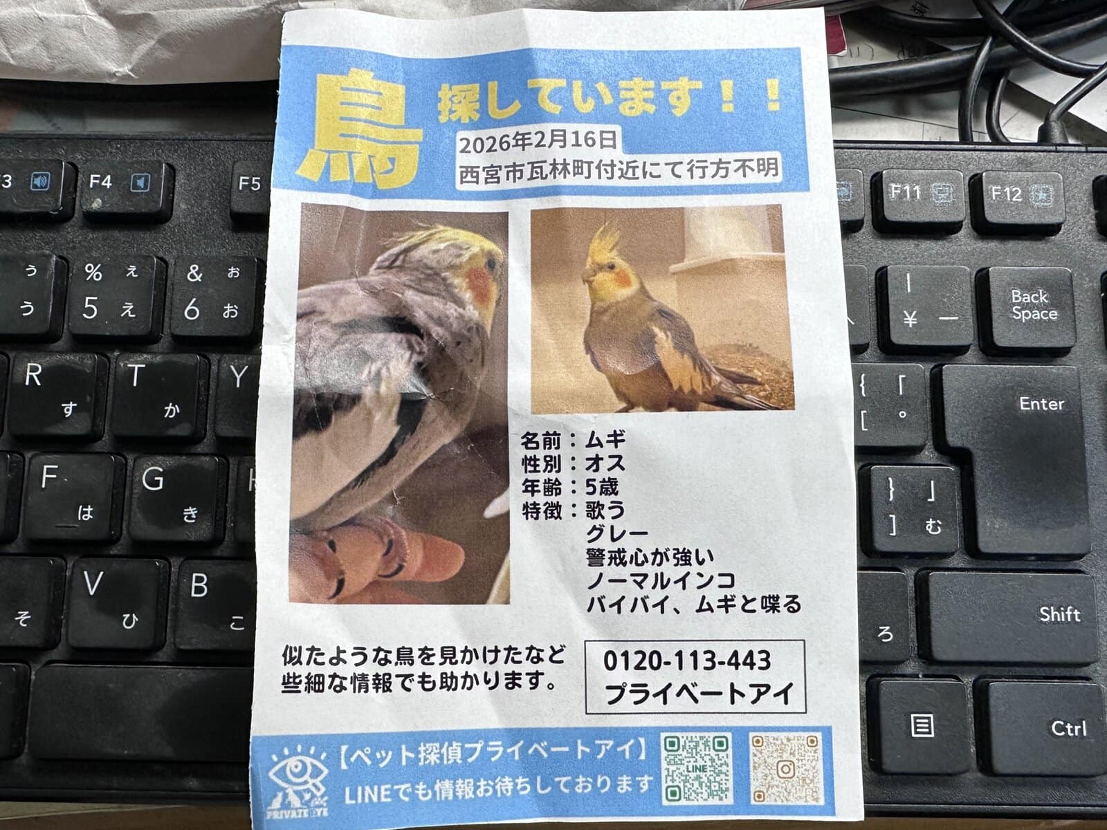瓦林町でインコちゃんがいなくなっちゃったみたいです。