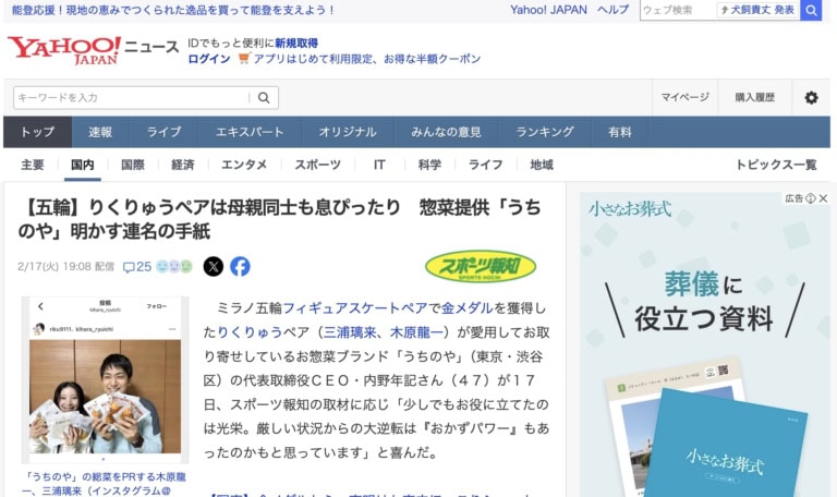 【五輪】りくりゅうペアは母親同士も息ぴったり 惣菜提供「うちのや」明かす連名の手紙(スポーツ報知) – Yahoo!ニュースより引用