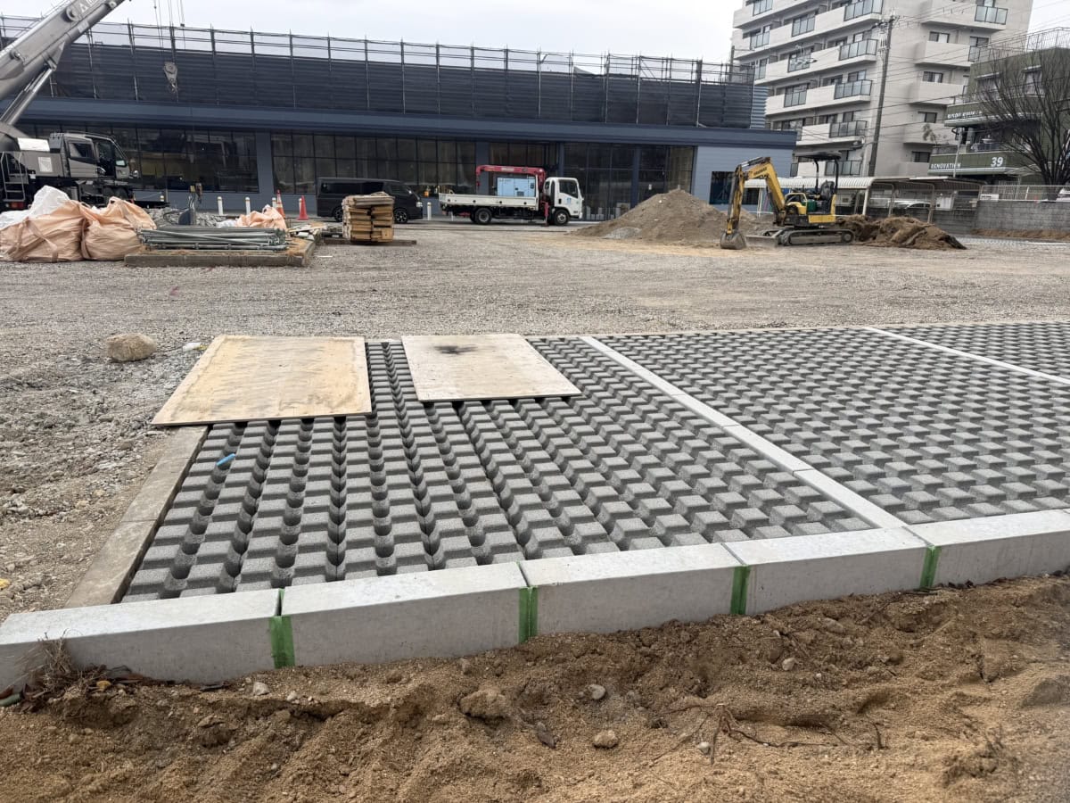 駐車場の舗装も全面的にやり直すようです。水がたまりにくそうなタイプの舗装になりそう。