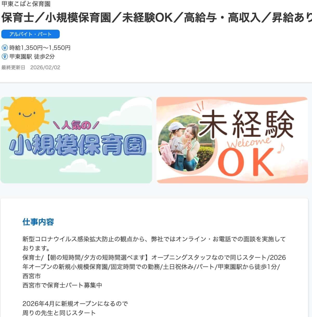 甲東こばと保育園 保育士/小規模保育園/未経験OK/高給与・高収入/昇給あり/交通費支給の求人詳細情報 – 兵庫県 西宮市 甲東園駅 徒歩2分|求人ボックスより引用