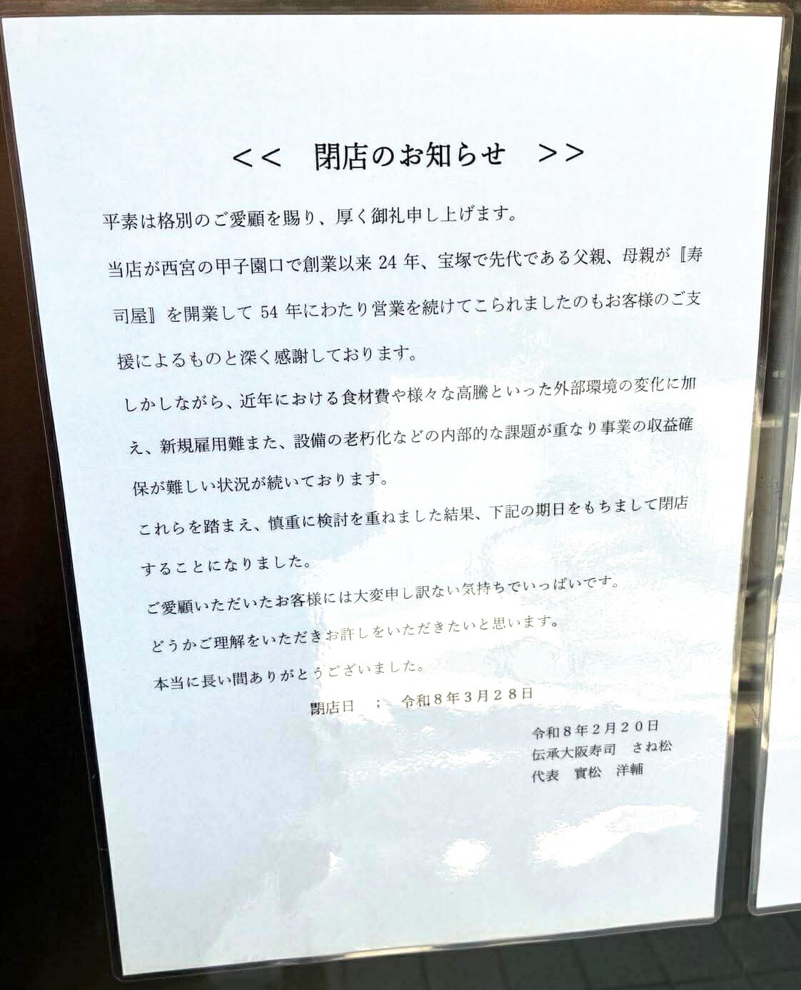 甲子園口ほんわか商店街の「伝承大阪寿司 さね松」が閉店するようです。