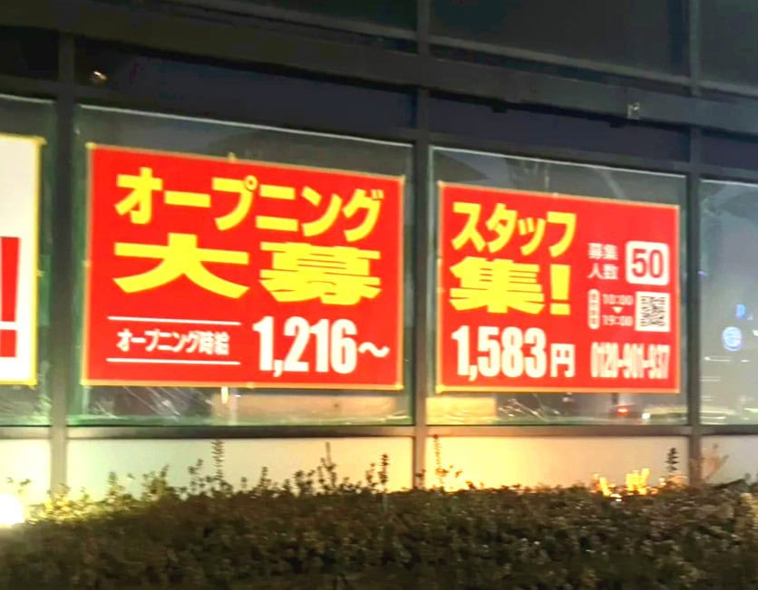 窓ガラスに4月旬グランドOPEN!の文字が大きく。