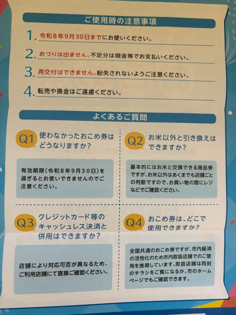 おこめ券や~!初めて見た!「国の重点支援地方交付金活用事業」って書いてある。通常版のものとは違うんですね。