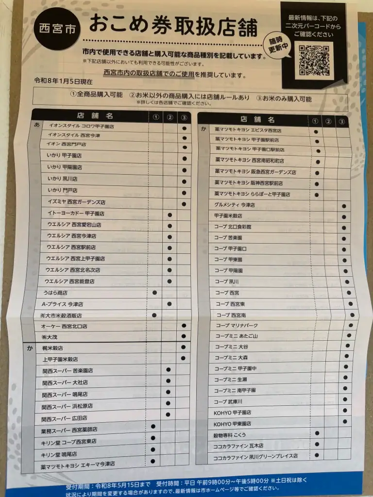 おこめ券は全国の米穀店やスーパー、ホームセンターやドラッグストアなどで使えます。でも今回は市内での使用がおすすめされてます~。地元活性化になるしね。