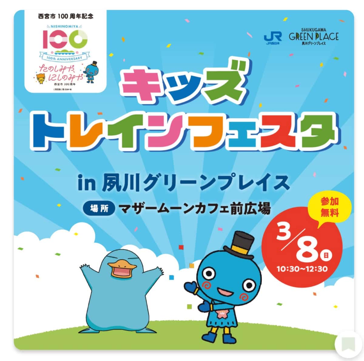 3月8日(日)、夙川グリーンプレイスで「キッズトレインフェスタ🚃in夙川グリーンプレイス」が開催されるようです。