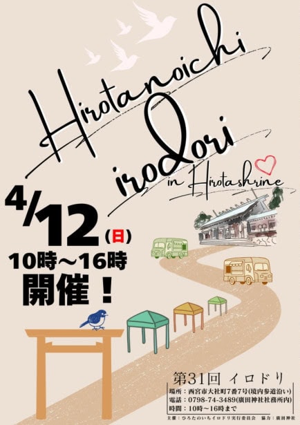 4月12日(日)、廣田神社で「ひろたのいちイロドリ」が開催されるようです。