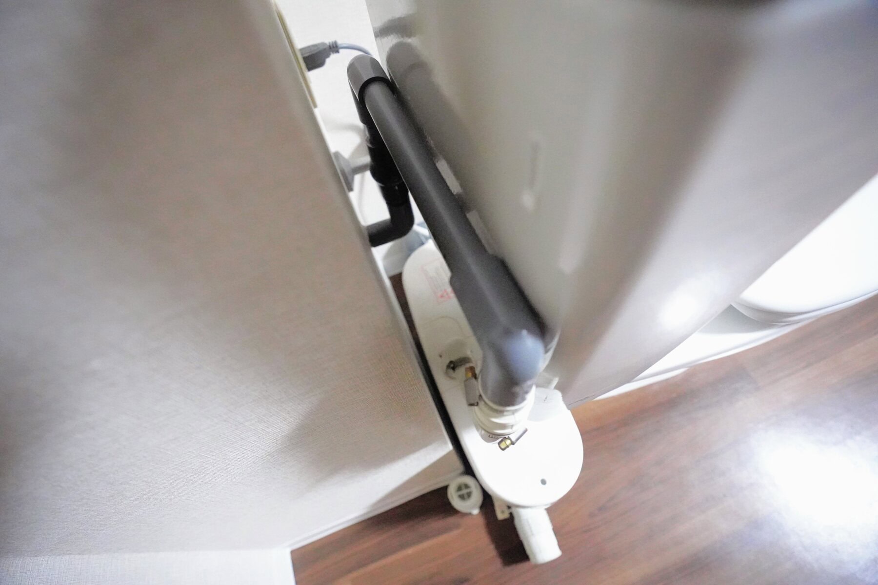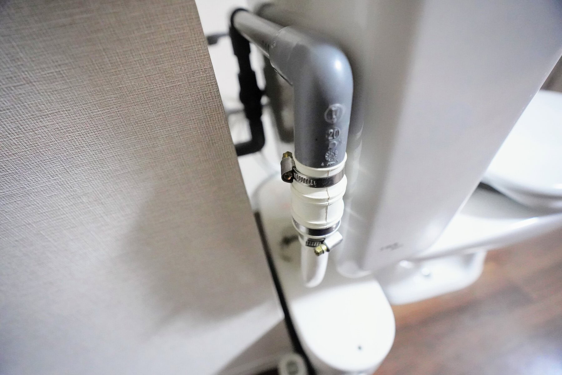 ふつうのトイレの排水管って直径75〜100mmの太いパイプが必要なんですけど、このシステムだと粉砕してから流すので20〜25mmの細いパイプでOKです。