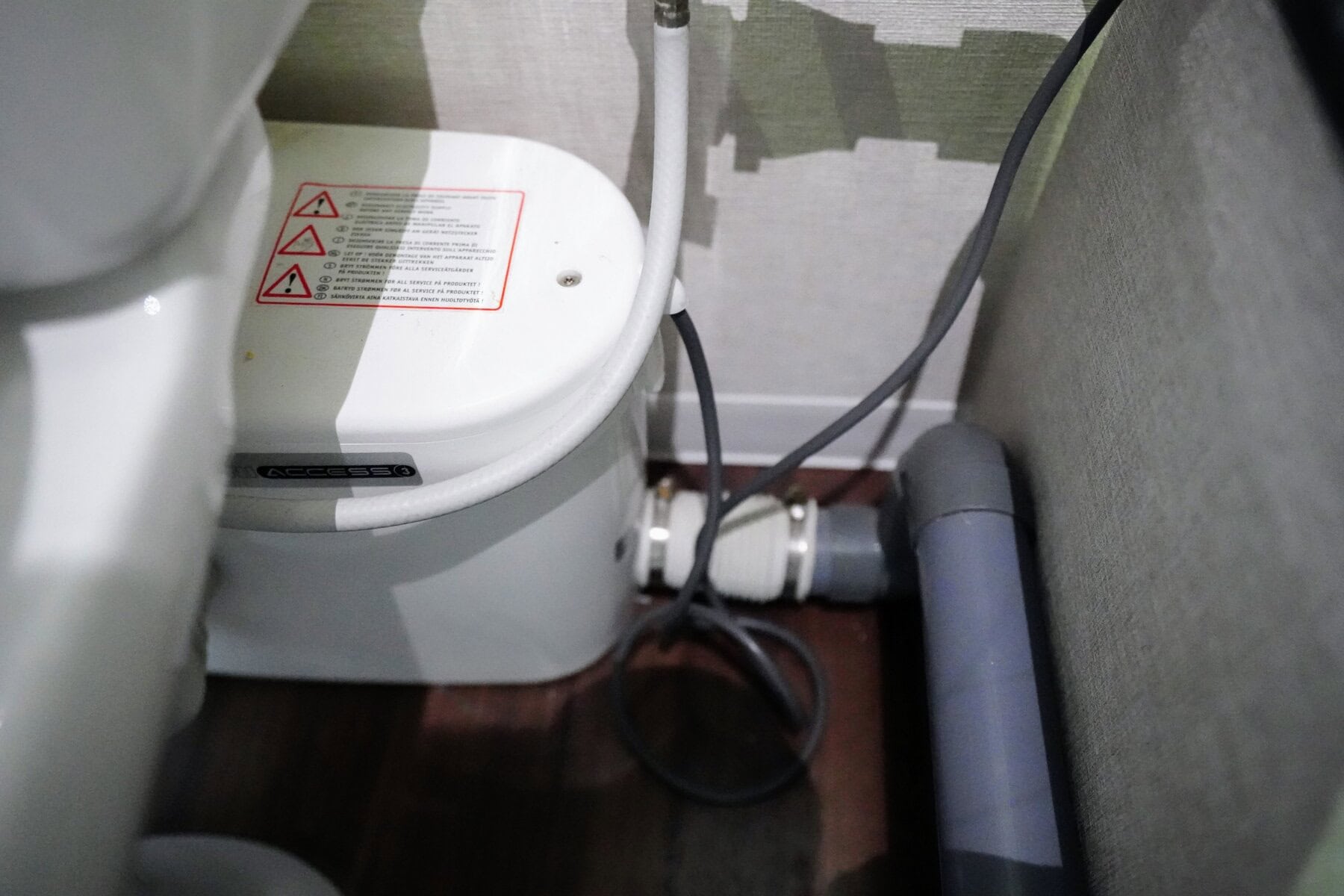 このボックスの中にはグラインダー(粉砕機)付きのポンプが入ってまして。排水が上に上がるんです。