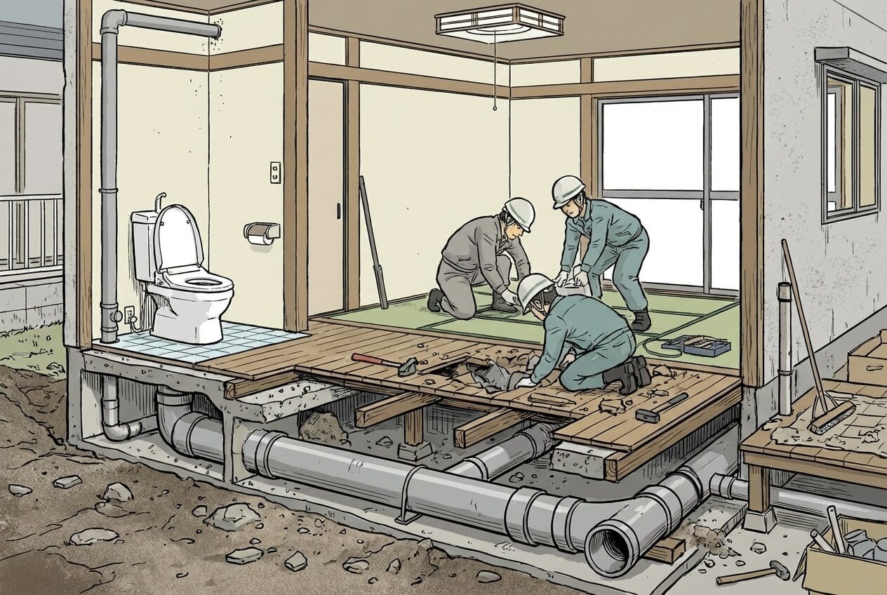 従来の方法で後からトイレを増設しようとすると、床を壊して太い排水管を通して