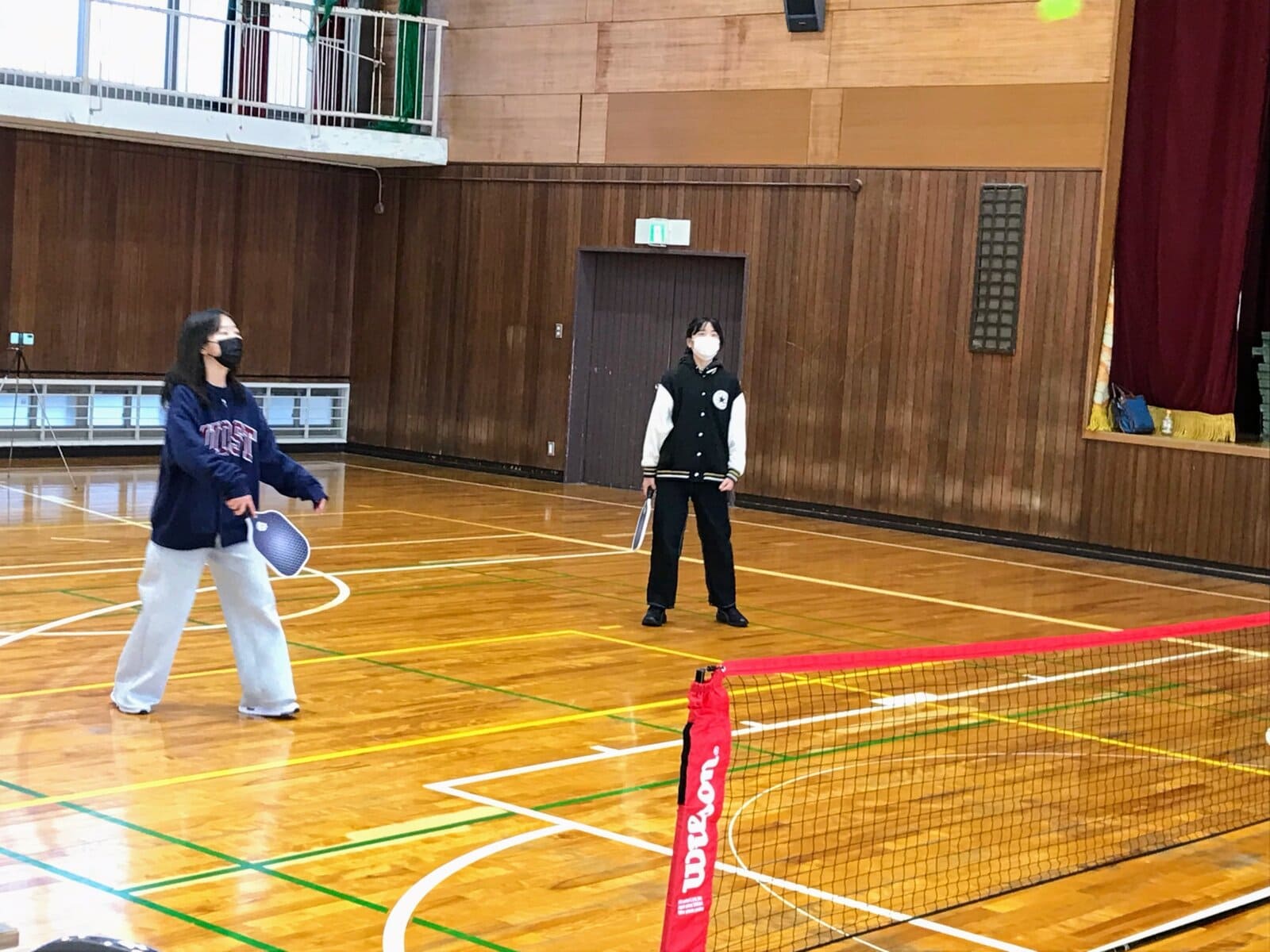 コートはバドミントンよりひと回り小さくて、プラスチックの穴あきボールを使うので、初心者でもラリーが続きやすいのがポイント〜〜