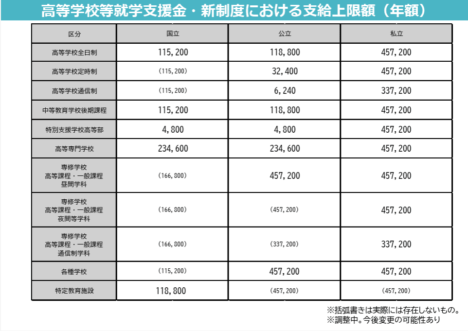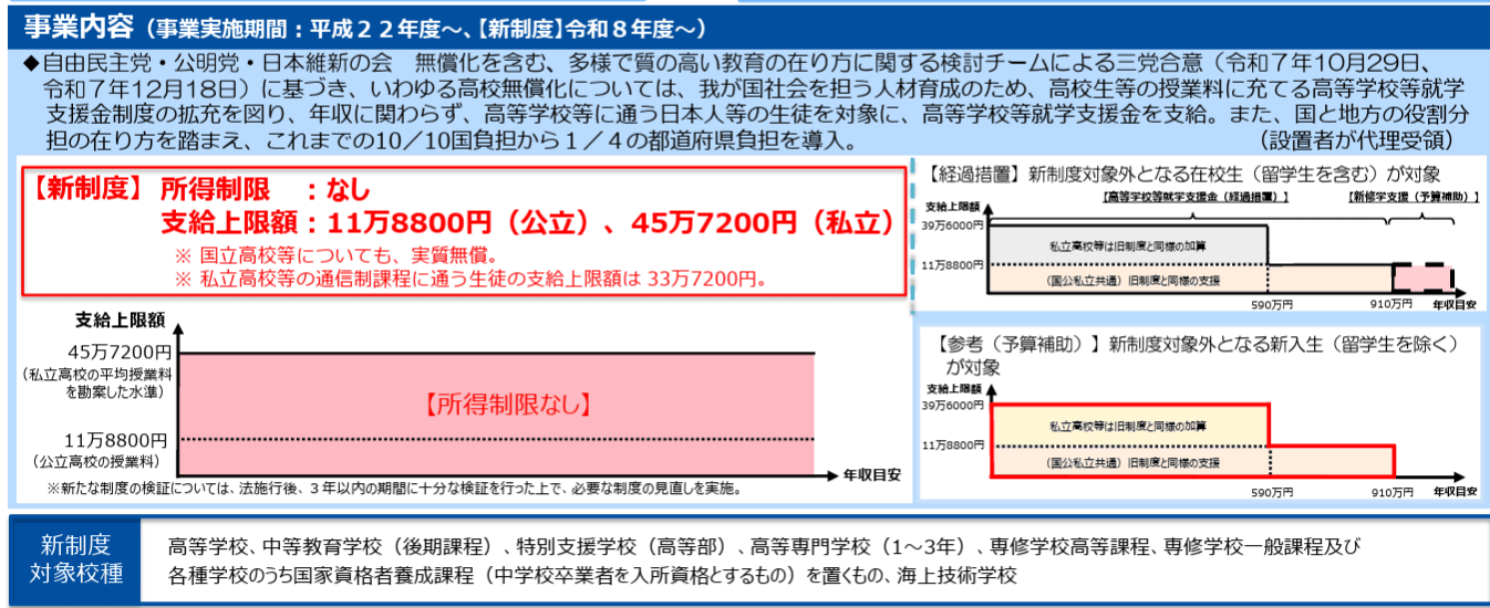「高等学校等就学支援金の支給に関する法律」の一部改正案が2026年2月27日の定例閣議で正式決定し、2026年度から全日制公立高校に通う場合は11万8000円、私立高校の場合は45万7200円が支給されます。(所得制限なし)