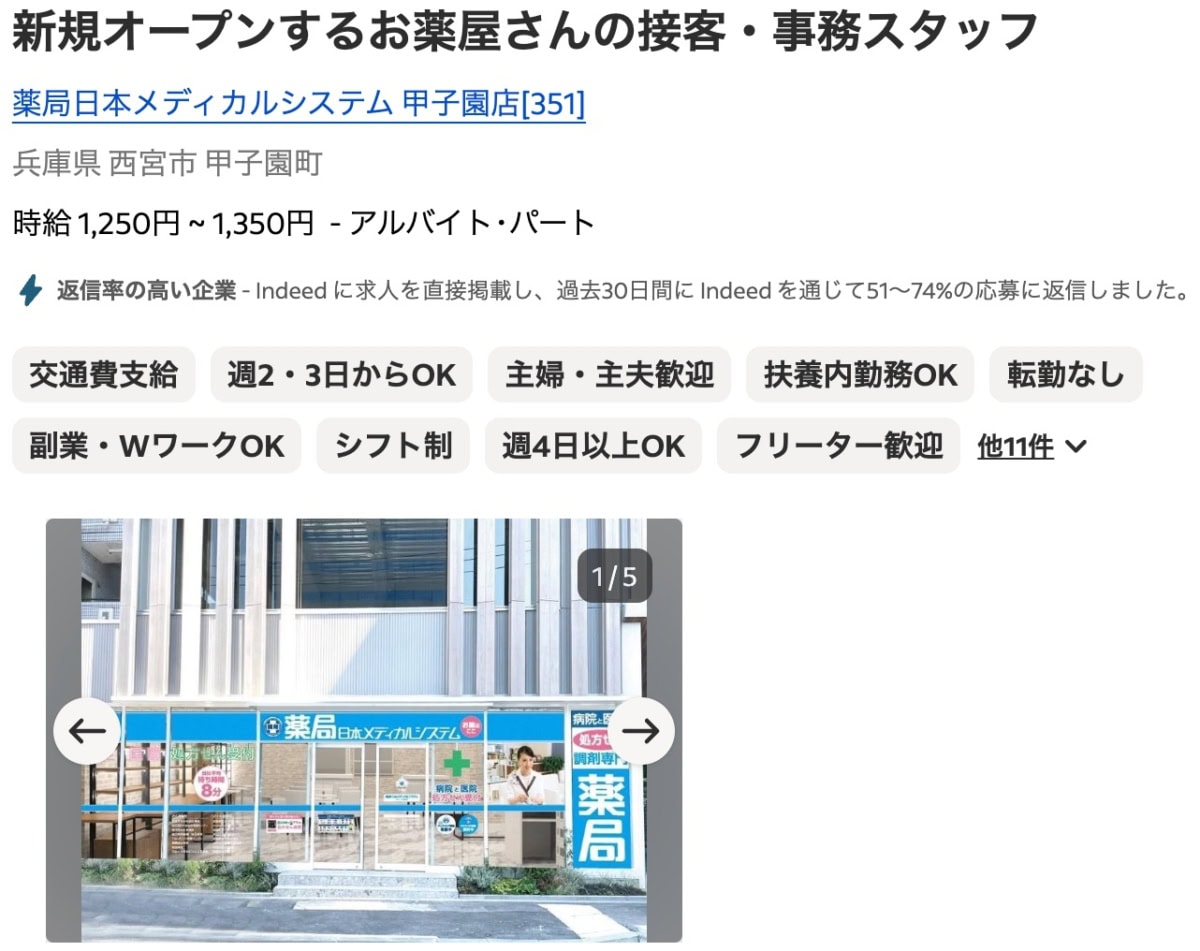 新規オープンするお薬屋さんの接客・事務スタッフ – 〒663-8152 兵庫県 西宮市 甲子園町 – Indeed.comより引用