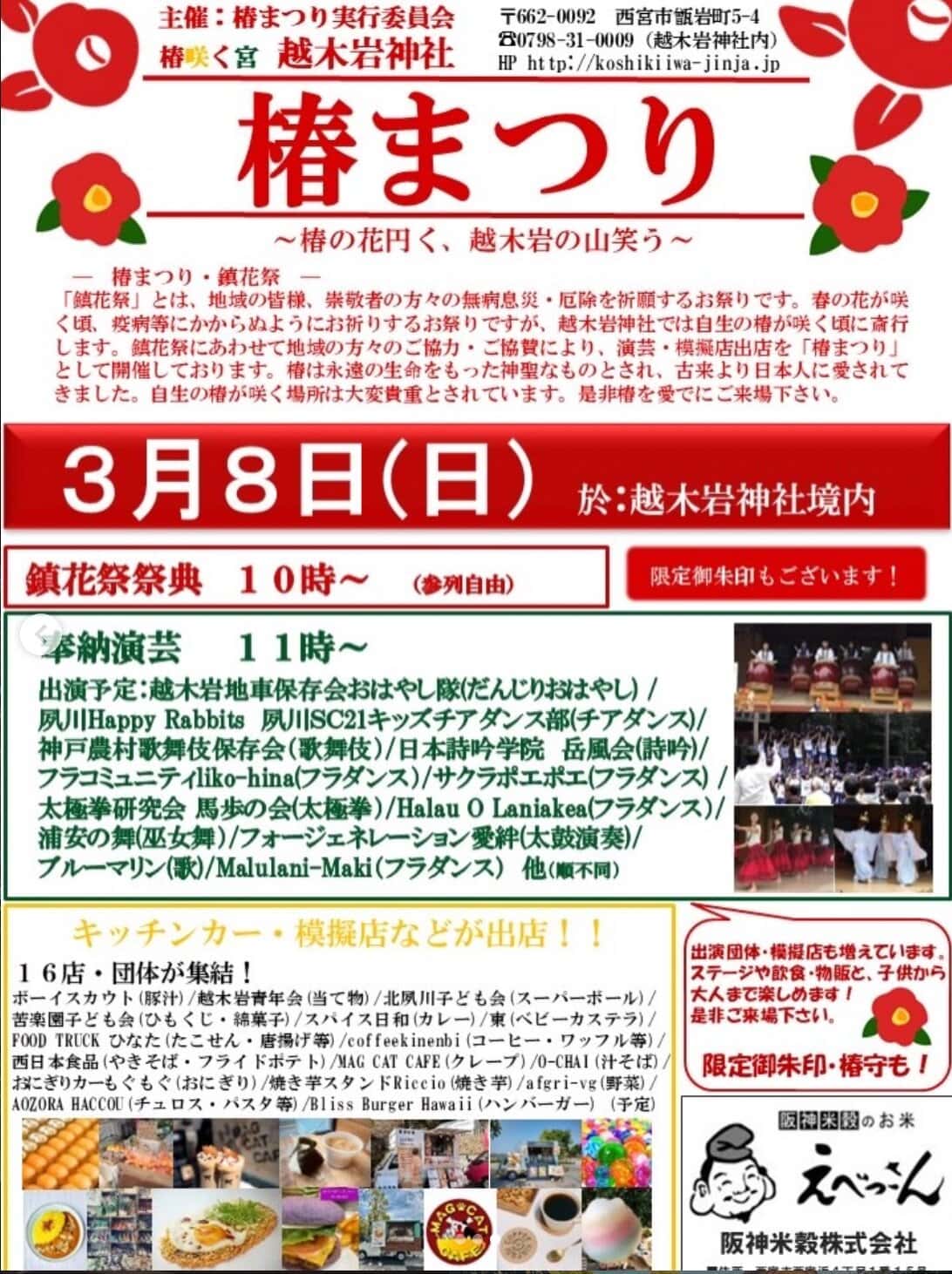 3月8日(日)に、越木岩神社で「椿祭り」が開催されるようです。