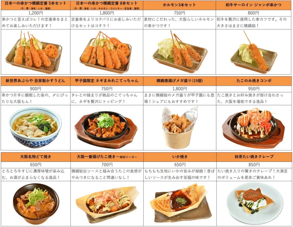 串かつを中心に、たこ焼き・どて焼き・かすうどんなど大阪グルメがずらり。甲子園限定メニューの「ネギまみれこてっちゃん」なんかもあって、観戦のお供によさそうなフードがいろいろそろってます😋