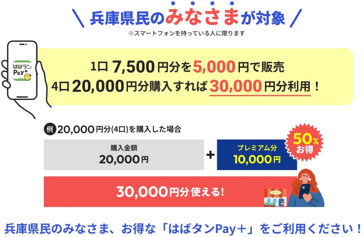 以下の画像は【公式】はばタンPay+(プラス)第5弾|ひょうご家計応援キャンペーン プレミアム付デジタル券より引用しました。