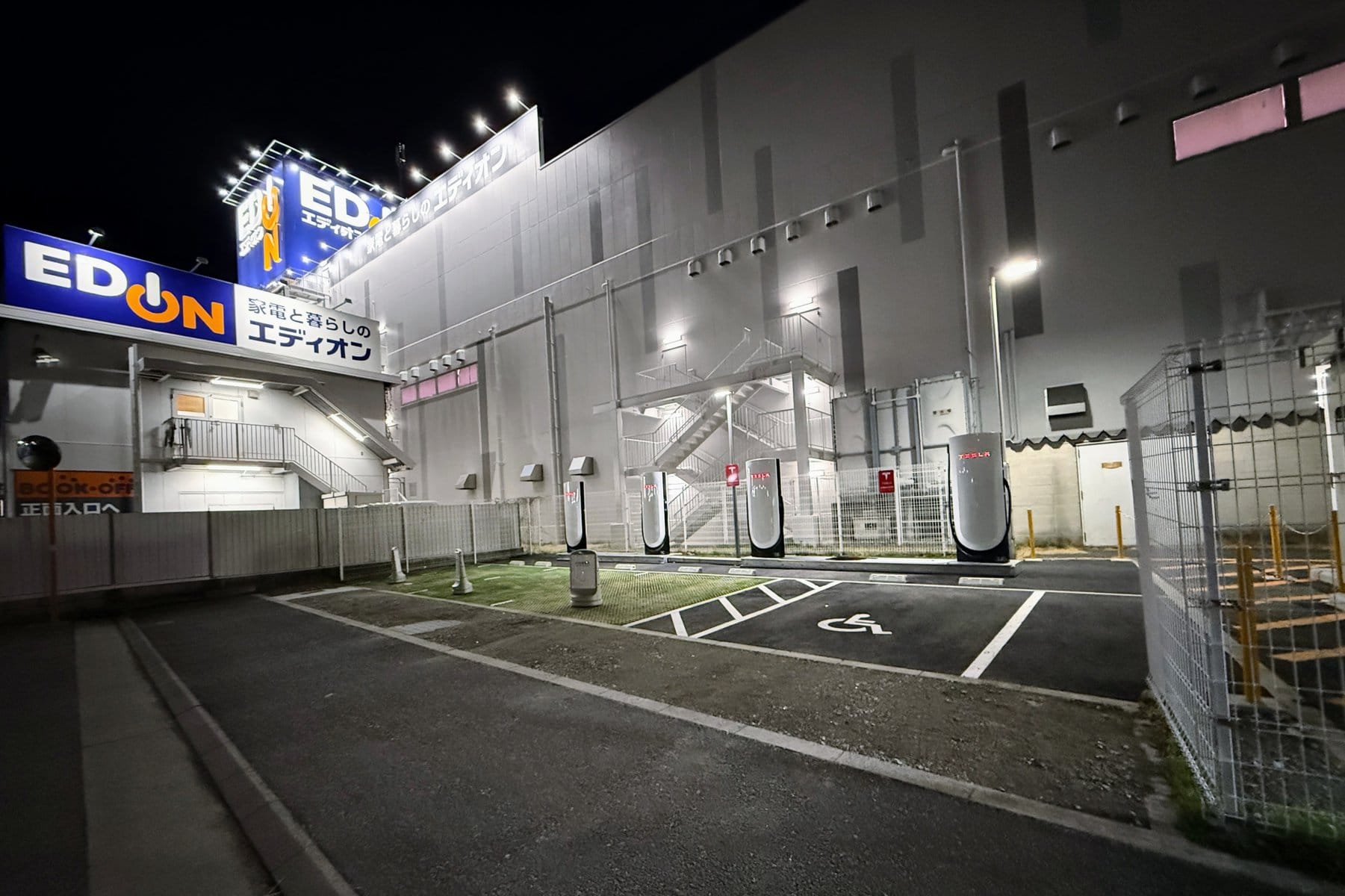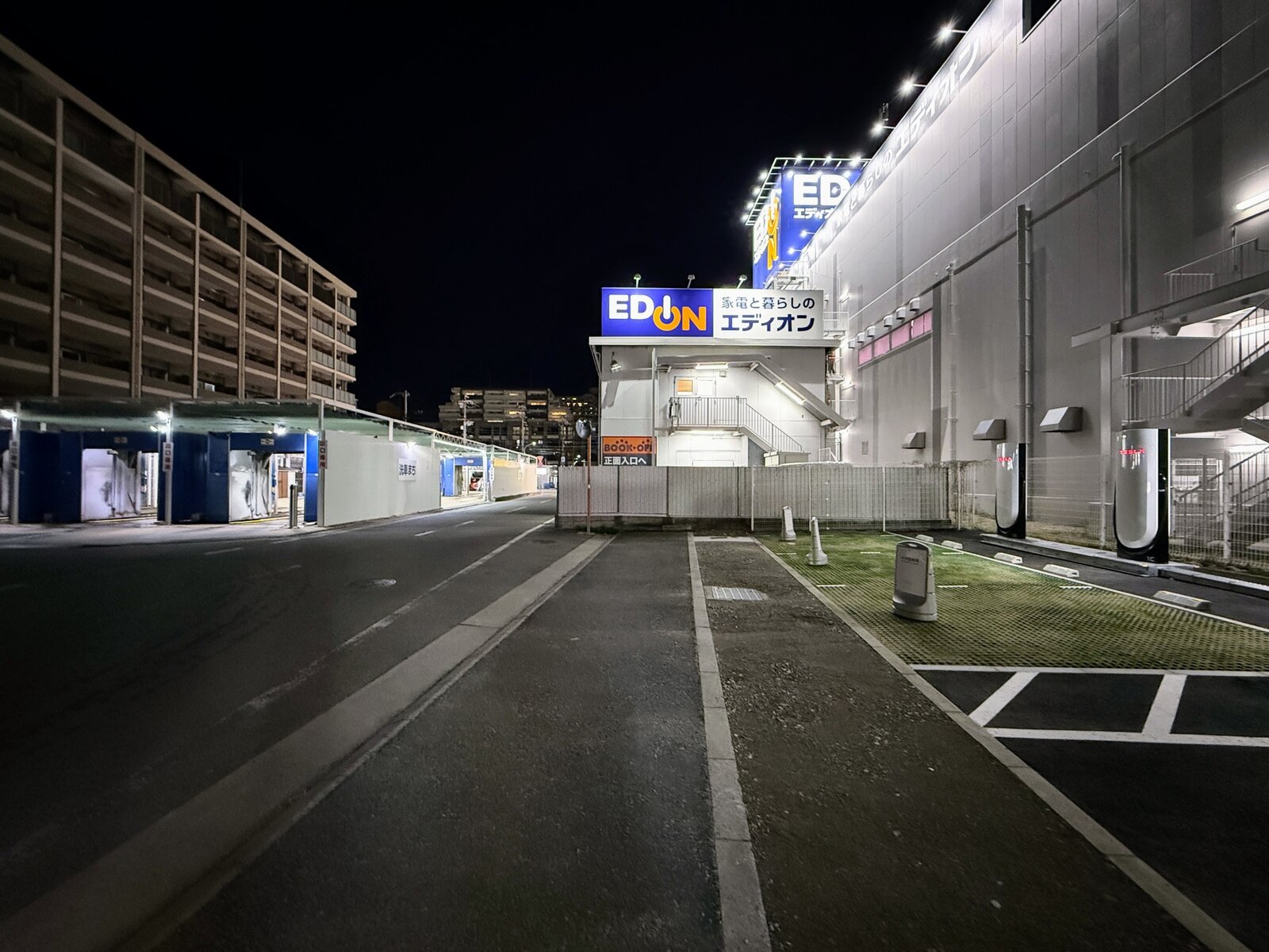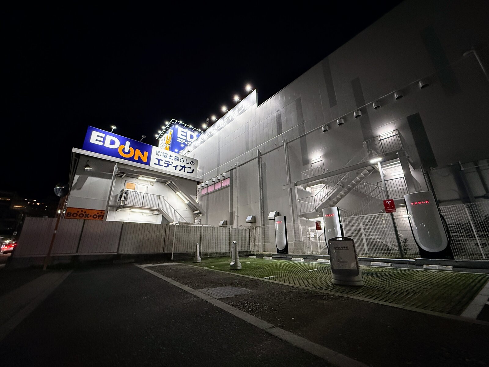 スーパーチャージャーの設置場所は投票とか提案とかできるそうです。充電中にエディオンで買い物したい方の提案が通ったのかも。