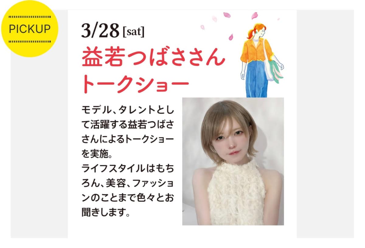 3月28日(土)、エビスタ西宮で「益若つばささん スペシャルトークイベント」が開催されるようです。