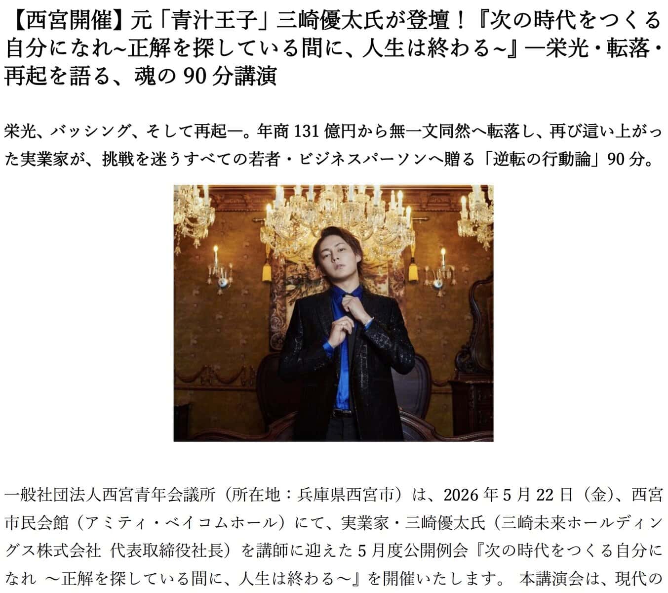 18歳で起業して年商131億円を達成したあと、転落と再起を経験した三崎さんが、90分の講演で「行動すること」について話してくれるそうです。