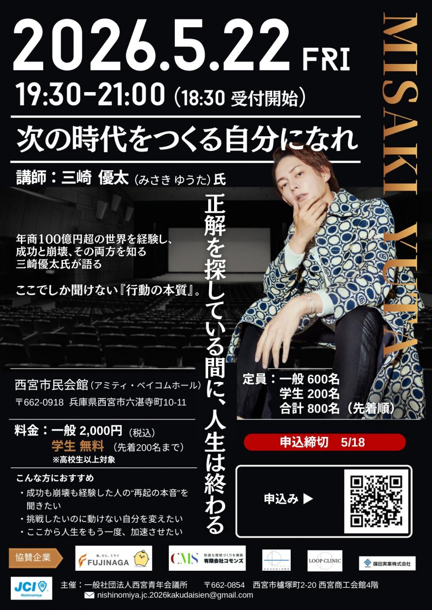 西宮青年会議所が主催する講演会で、テーマは「次の時代をつくる自分になれ ~正解を探している間に、人生は終わる~」とのこと。