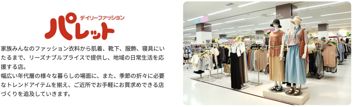 「デイリーファッションパレット」は、西日本を中心に展開している家族向けの総合衣料店。西宮市内では小曽根線沿いにあるコープ西宮東2階にもあります。レディース・メンズ・キッズの服に加えて、肌着、靴下、服飾雑貨、寝具までそろう、日常使いしやすいお店。価格もお手頃で、近所で気軽に買いやすいのも特徴です。