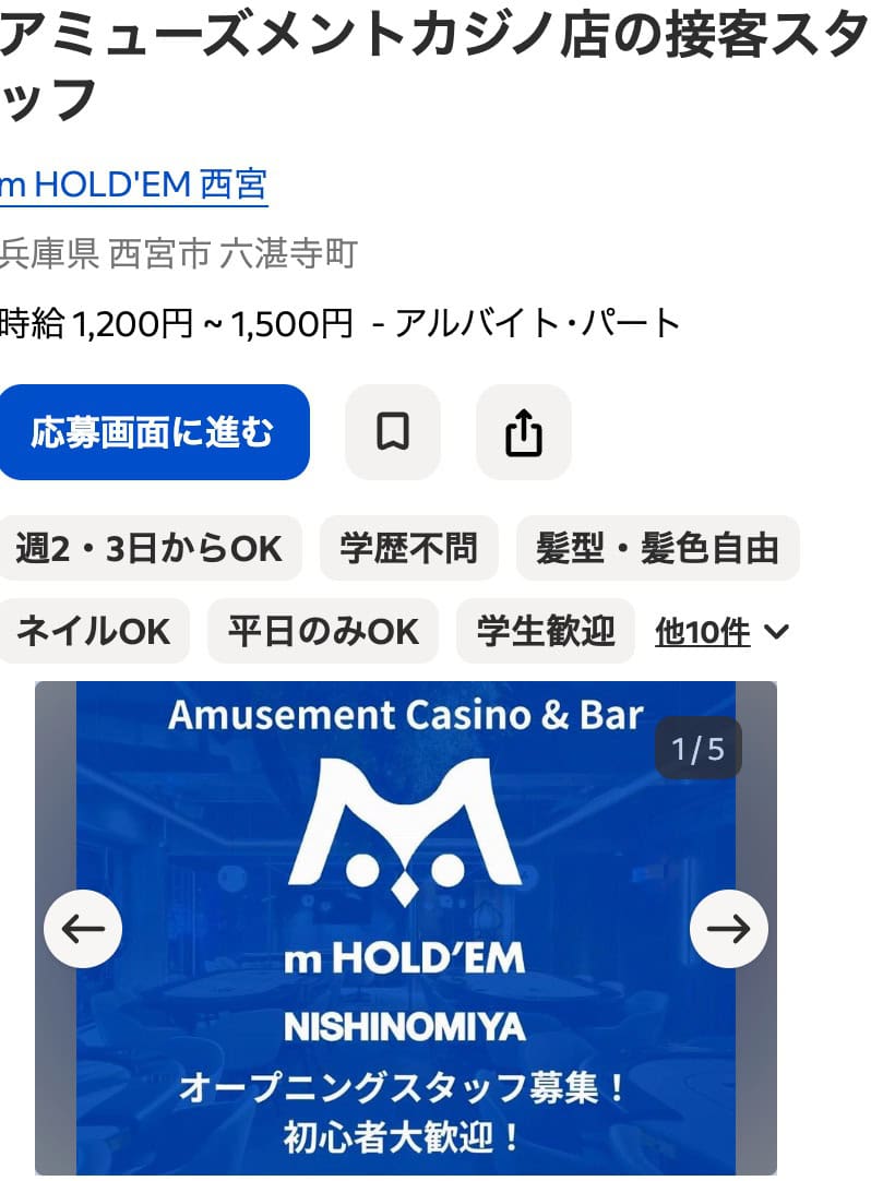 アミューズメントカジノ店の接客スタッフ – 〒662-0918 兵庫県 西宮市 六湛寺町 – Indeed.comより引用