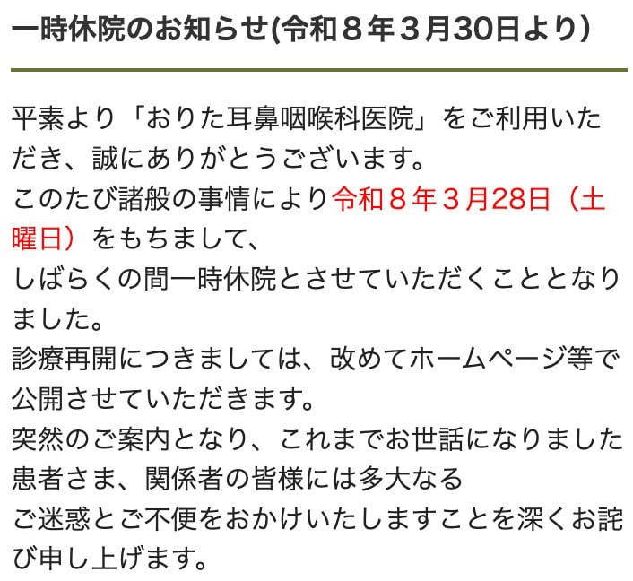 中津浜線沿い下大市東町にある「おりた耳鼻咽喉科医院」が、しばらく休院するようです。