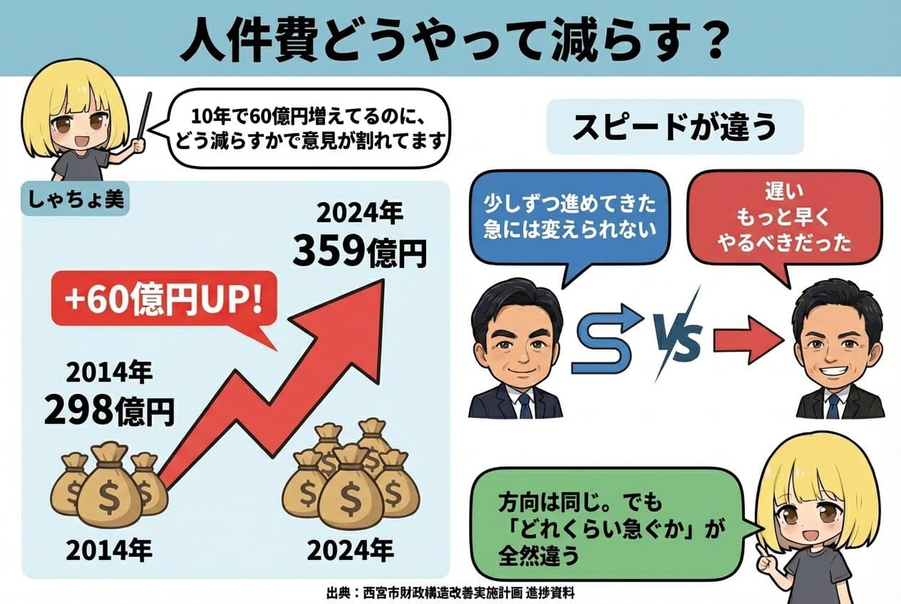 ②おかね編でも書きましたが、西宮市は人件費が10年で約60億円増。毎年入るお金のほぼ全部が固定費で消えてる状態。