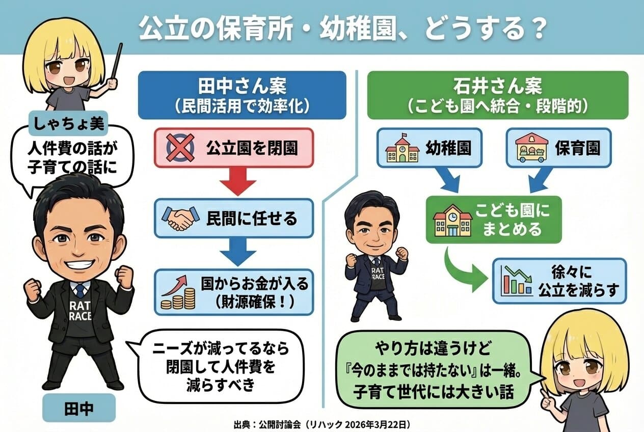 田中さんは「今のやり方では遅い。人件費や公立園にもっと手をつけるべき」