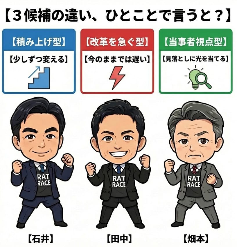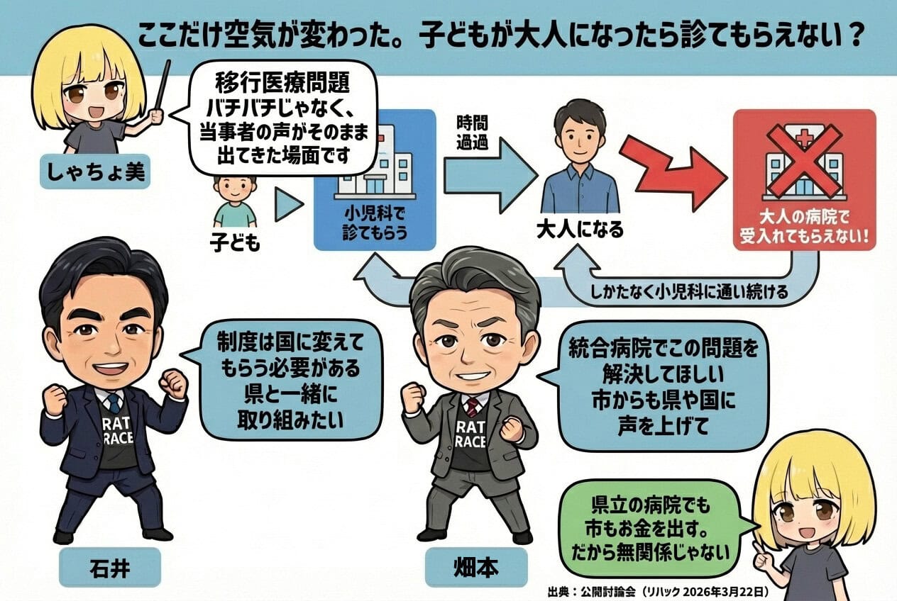 青年会議所の討論会でも畑本さんはこのテーマで石井さん・田中さんの両方に質問してたので、いちばん思い入れが強いテーマなんだと思います。