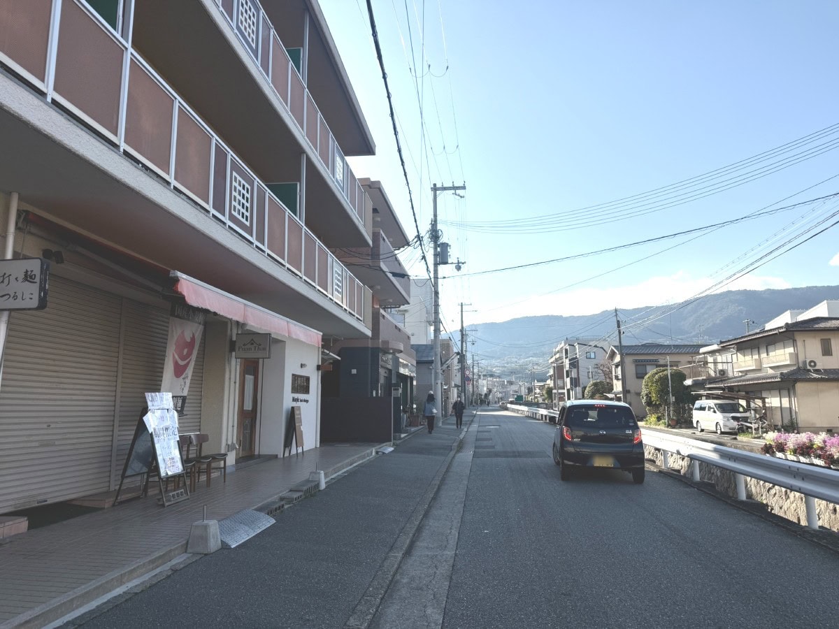 反対方向に行くと、おとなりに手打ち麺つるしこがあり、越木岩筋にでます。