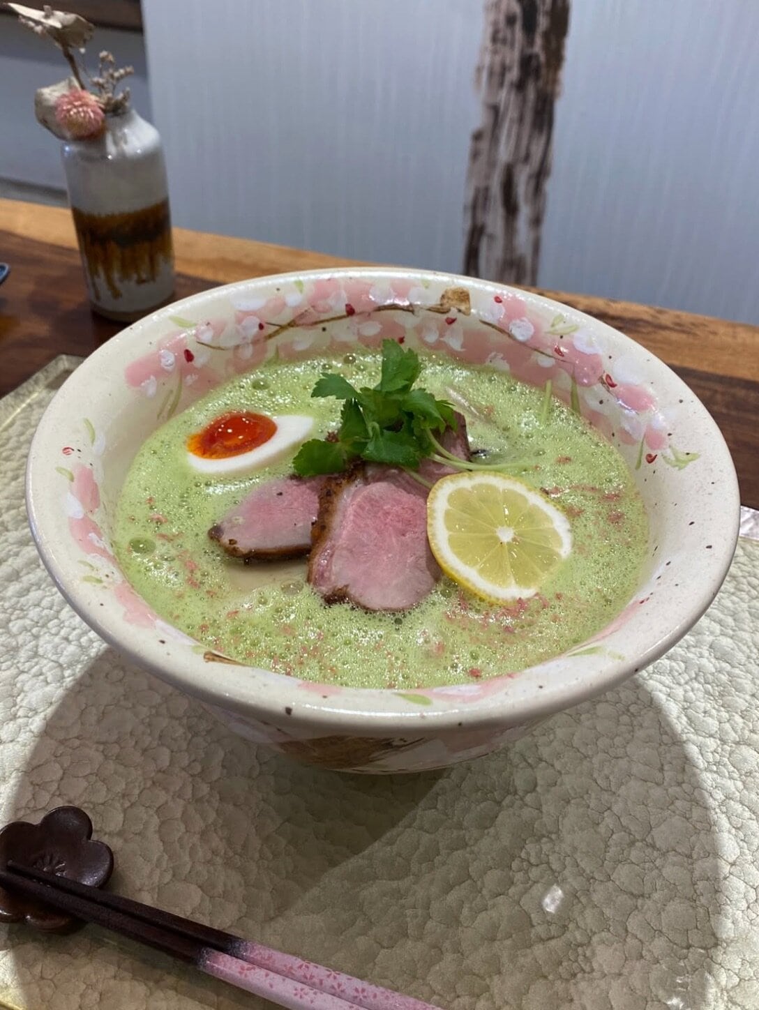桜薫る宇治抹茶鶏白湯ラーメンのビジュがすごい!斬新すぎる〜〜。