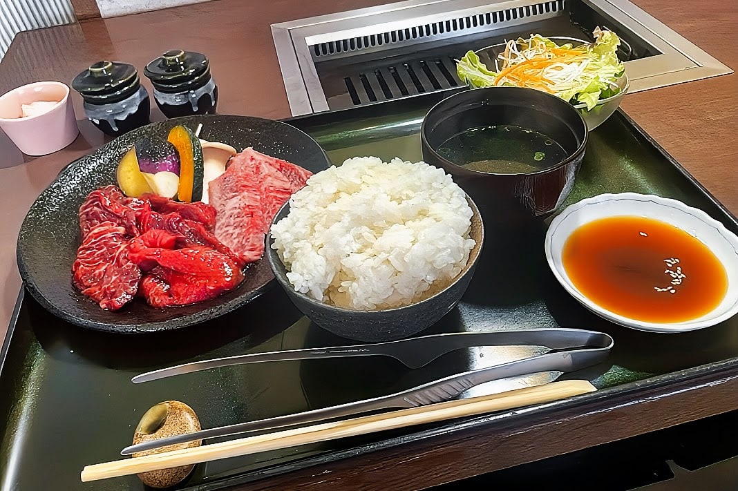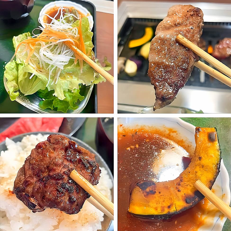 上カルビ・赤身・ハラミに焼き野菜と、焼肉のええとこどりなセット。