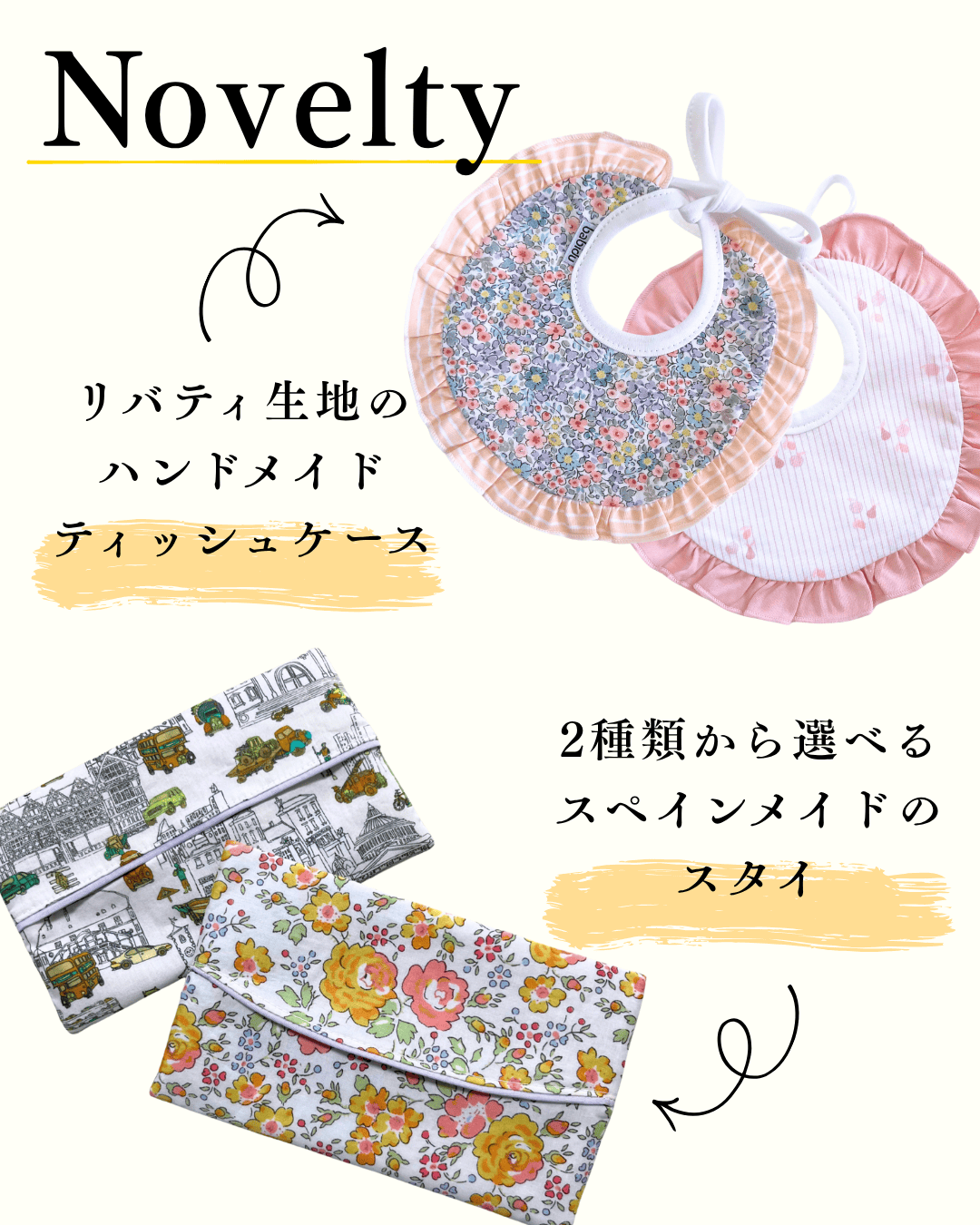 スペイン製のおしゃれなスタイ」または「リバティ生地のハンドメイド ポケットティッシュケース」いずれか1つプレゼント(先着順)