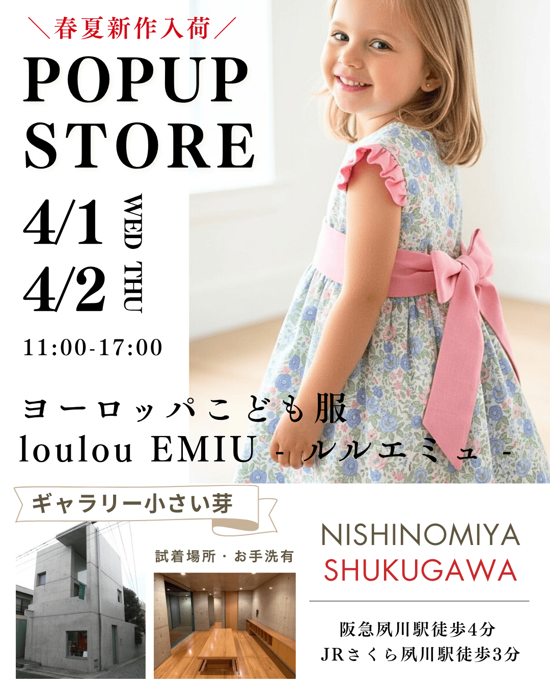 「可愛いだけじゃなく、品がある」と西宮ママに評判のヨーロッパ子ども服「ルルエミュ」のPOPUP STOREが夙川で開催されます〜。
