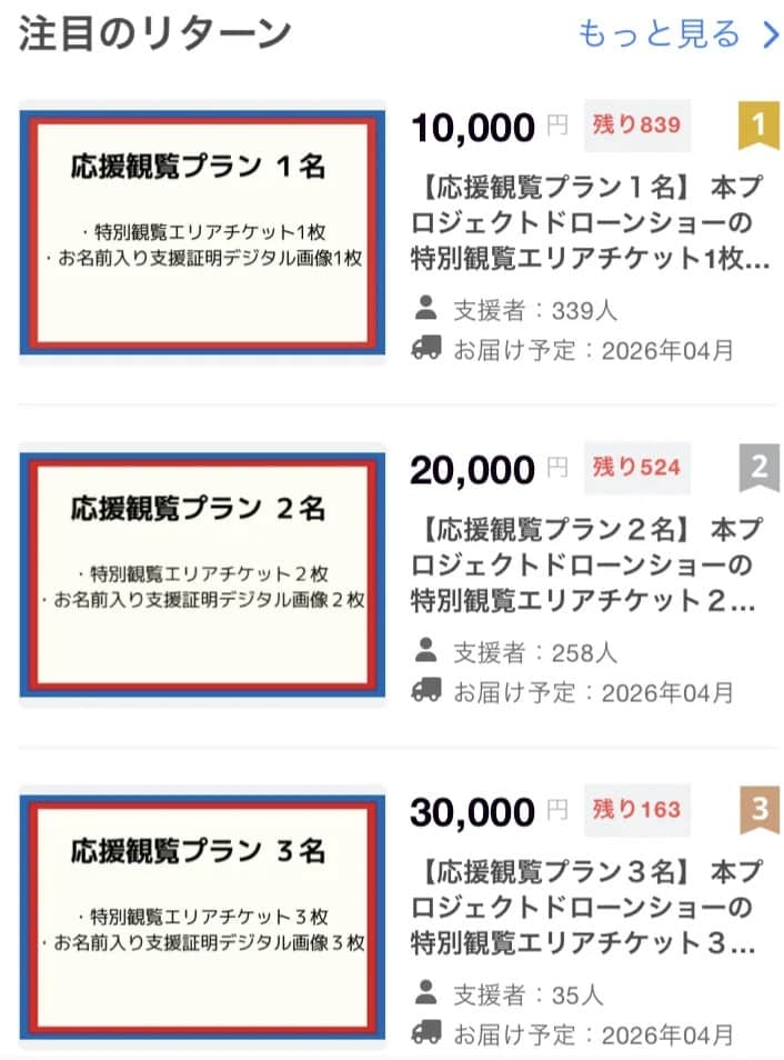 リターンには、当日会場でドローンショーを見やすいエリアで観覧できるチケットもあり。現地であの空気を味わいたい方にはかなり良さそう。現時点でまだ数百枚残ってますので、今なら間に合います!