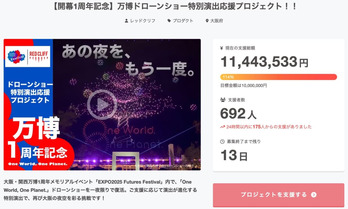 クラファンは開始からまだ2日ほどですが、すでに目標の1,000万円を突破し、記事を書いている時点で114%達成。さすが万博😂