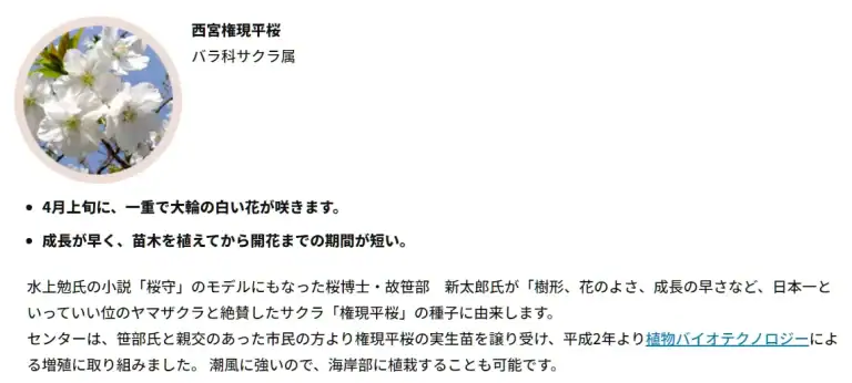 オリジナルの桜の中でも、名前に“西宮”がつくのは西宮権現平桜だけなんです。見頃は4月中旬ぐらいまでだそう。ソメイヨシノよりも少し遅れて咲くので、今からでもお花見🌸に間に合いますよ。急げ~!