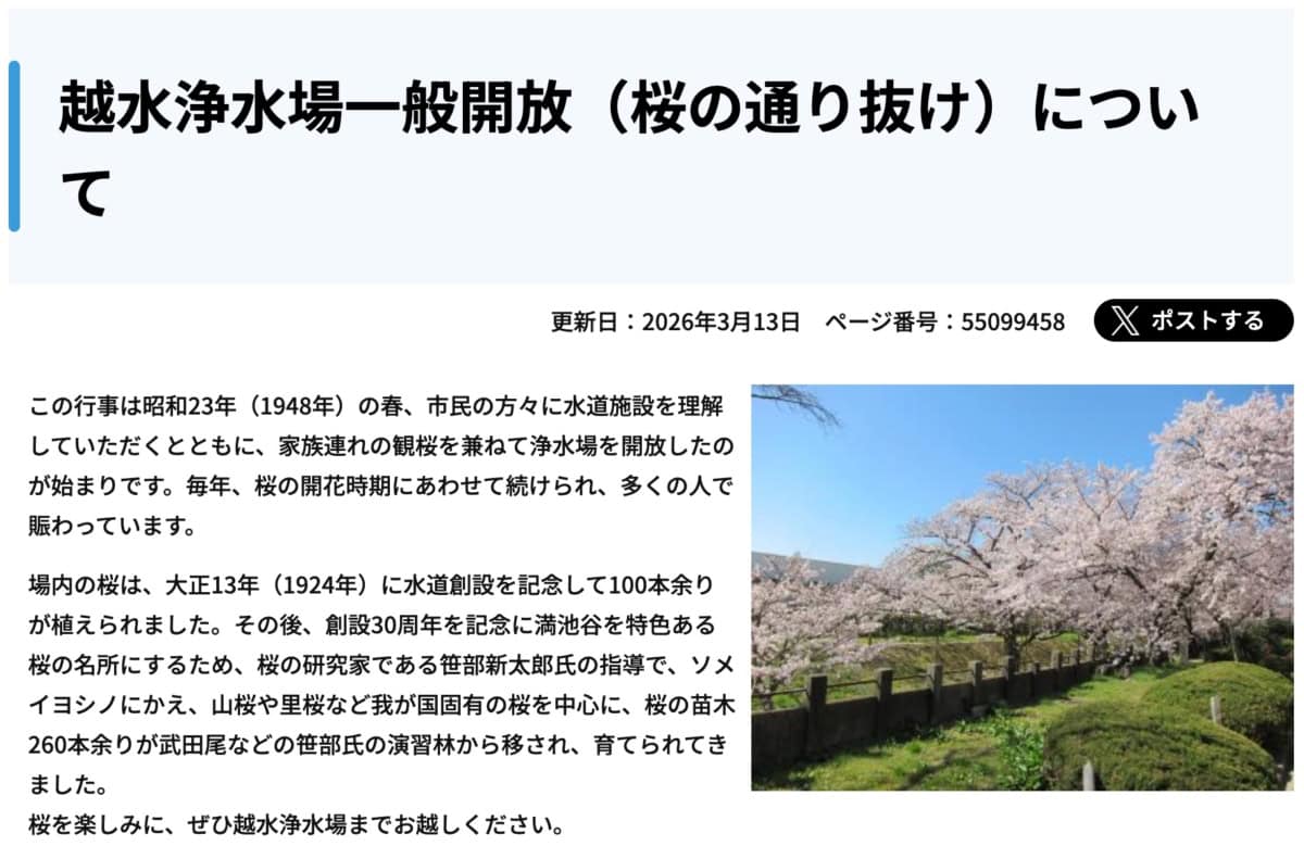 越水浄水場の桜の通り抜けが始まっているようです。